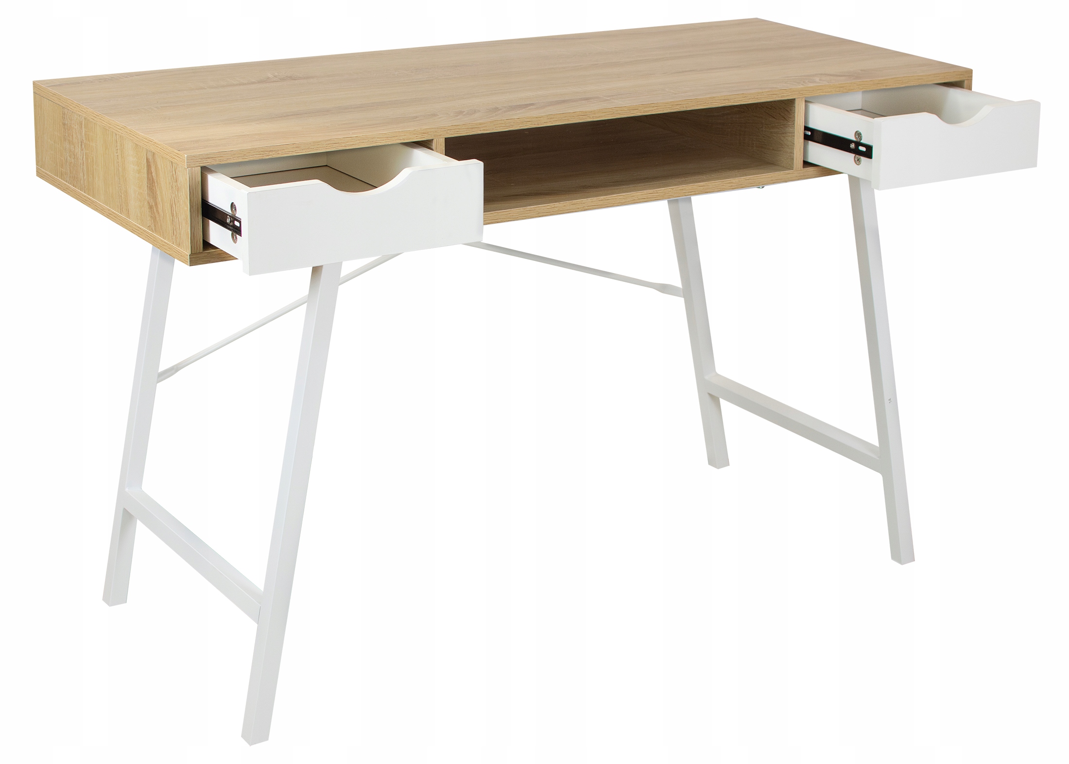 Wyposażone w dwie pojemne szuflady oraz dodatkową otwartą półkę, biurko umożliwia wygodne uporządkowanie niezbędnych przedmiotów.