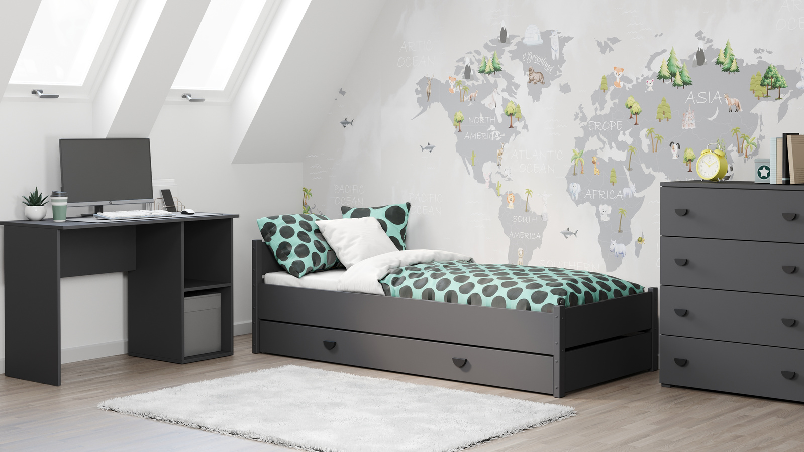 Biurko TAKO oferuje szeroki blat, zapewniając komfortowe miejsce do pracy, nauki czy kreatywnej działalności. Dodatkowa boczna półka zwiększa praktyczność, umożliwiając wygodne przechowywanie najpotrzebniejszych rzeczy. Wykonane z laminowanej płyty meblowej, biurko cechuje się odpornością na codzienne użytkowanie oraz łatwością w czyszczeniu. Uniwersalność produktu podkreśla możliwość wyboru koloru, co pozwala na idealne dopasowanie do charakteru wnętrza.
