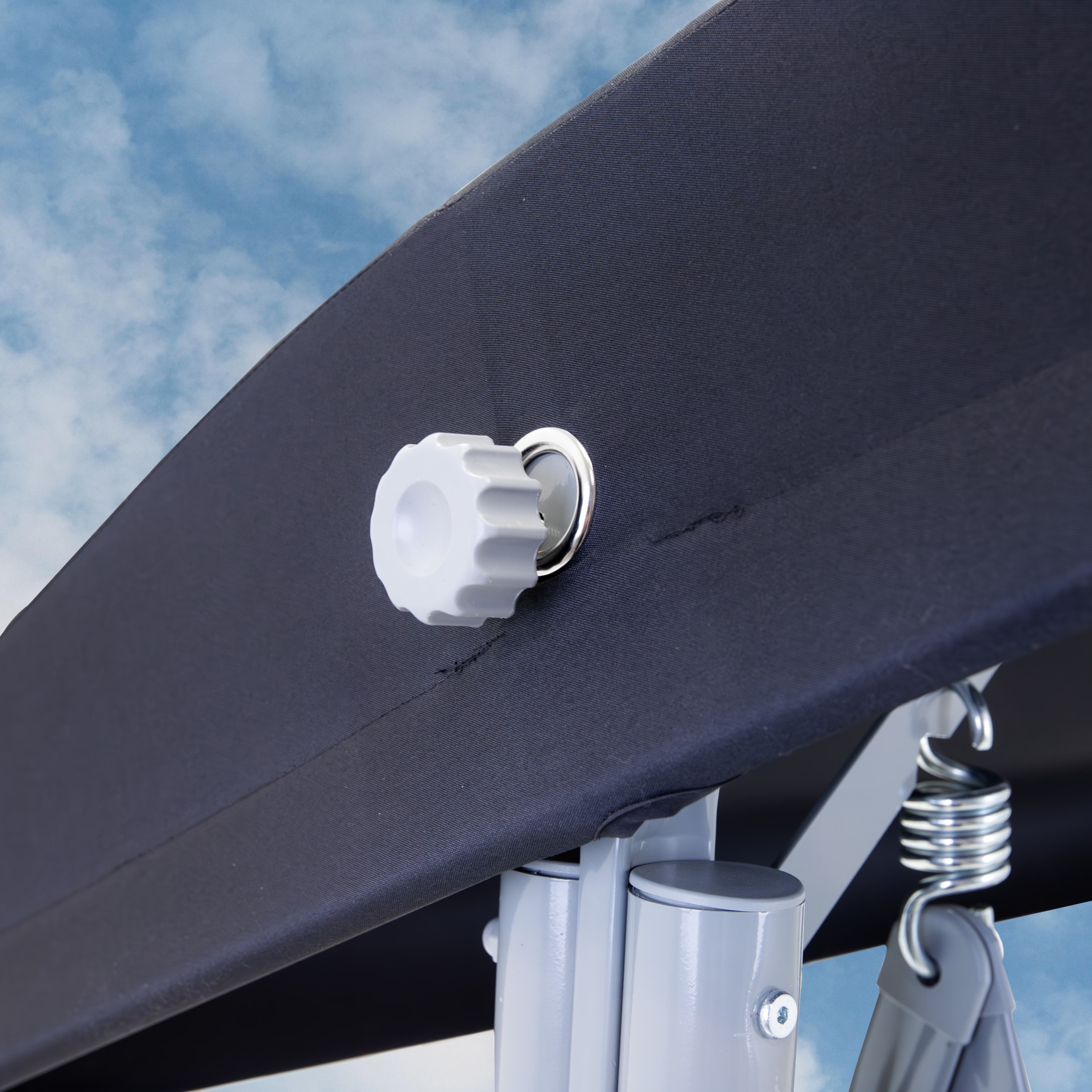 Pozwala dostosować kąt nachylenia do pozycji słońca lub zabezpieczyć się przed niespodziewanym deszczem. Materiał jest trwały i odporny na zmienne warunki pogodowe.