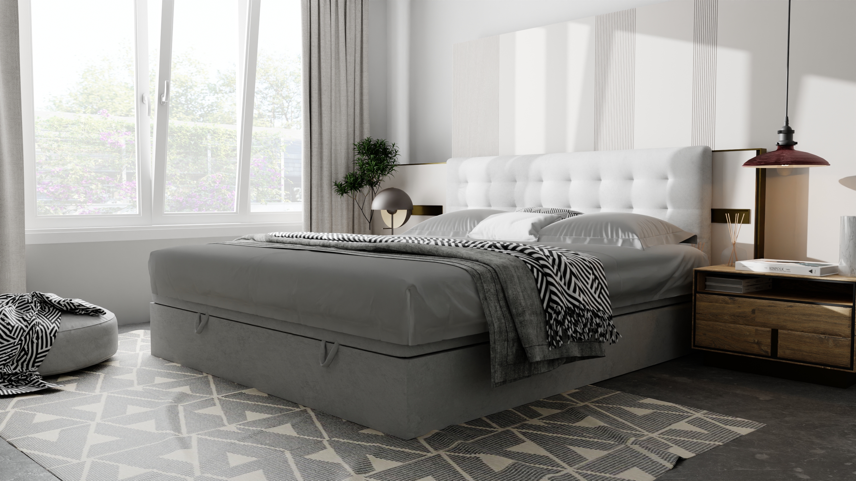 Dolna część łóżka skrywa pojemnik na pościel, idealny do przechowywania dodatkowych koców, poduszek i pościeli. Łatwy dostęp i wygodne otwieranie pojemnika ułatwiają utrzymanie porządku w sypialni.