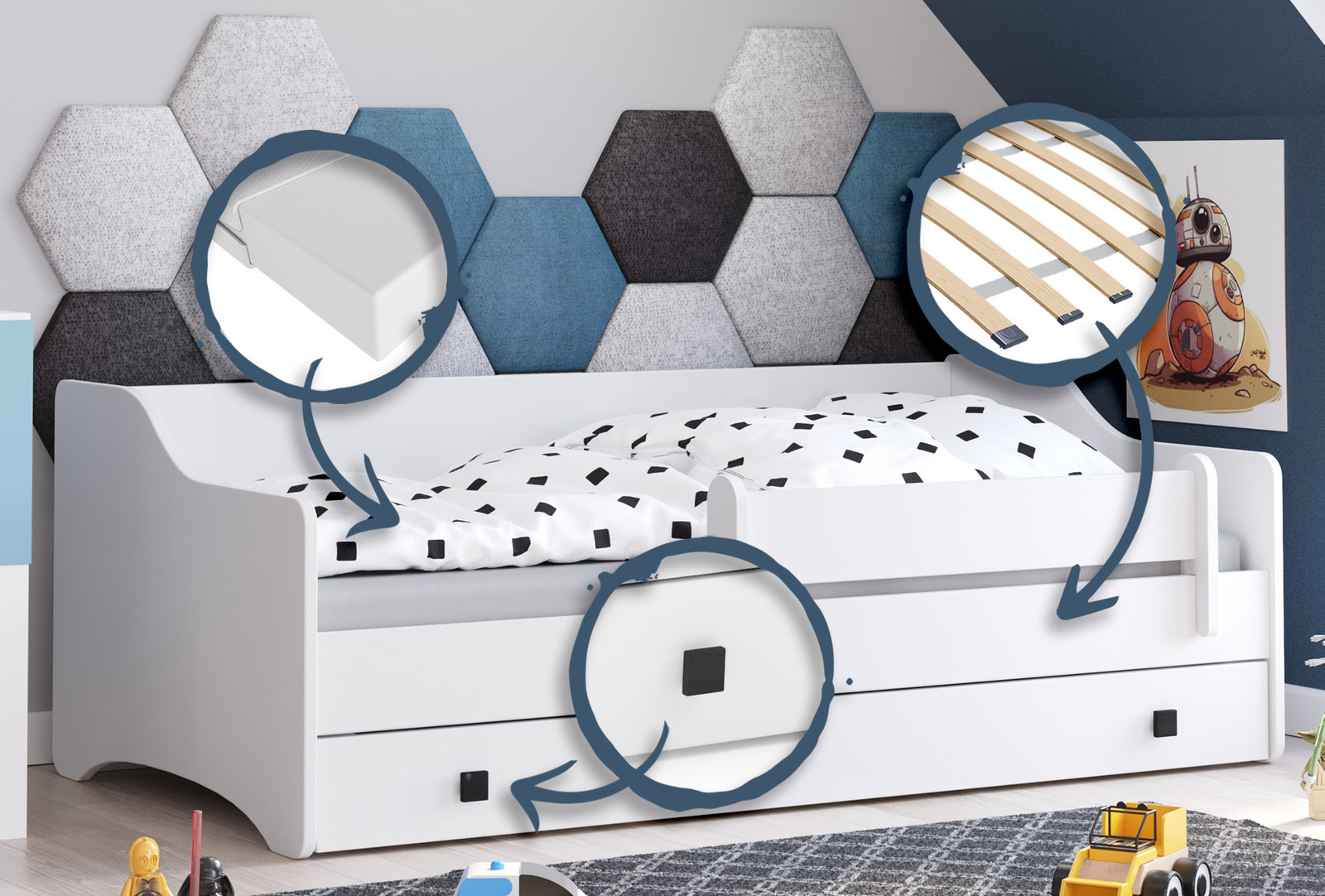 Wykonane z wysokiej jakości płyty meblowej, łóżko Eryk zapewnia solidność i odporność na uszkodzenia. Dodatkowo, naturalne drewno jodłowe, z którego wykonany jest stelaż, wprowadza do wnętrza ciepło i naturalny urok. Łóżko posiada zaokrąglone krawędzie, co minimalizuje ryzyko urazów, oraz praktyczną szufladę na pościel lub zabawki, co pozwala utrzymać porządek w pokoju. Ruchoma barierka zapewnia dodatkową ochronę dziecka, a stelaż FLEX z listew sprężynujących gwarantuje wygodny sen. To idealny wybór dla każdego rodzica, który ceni bezpieczeństwo, komfort i estetykę.