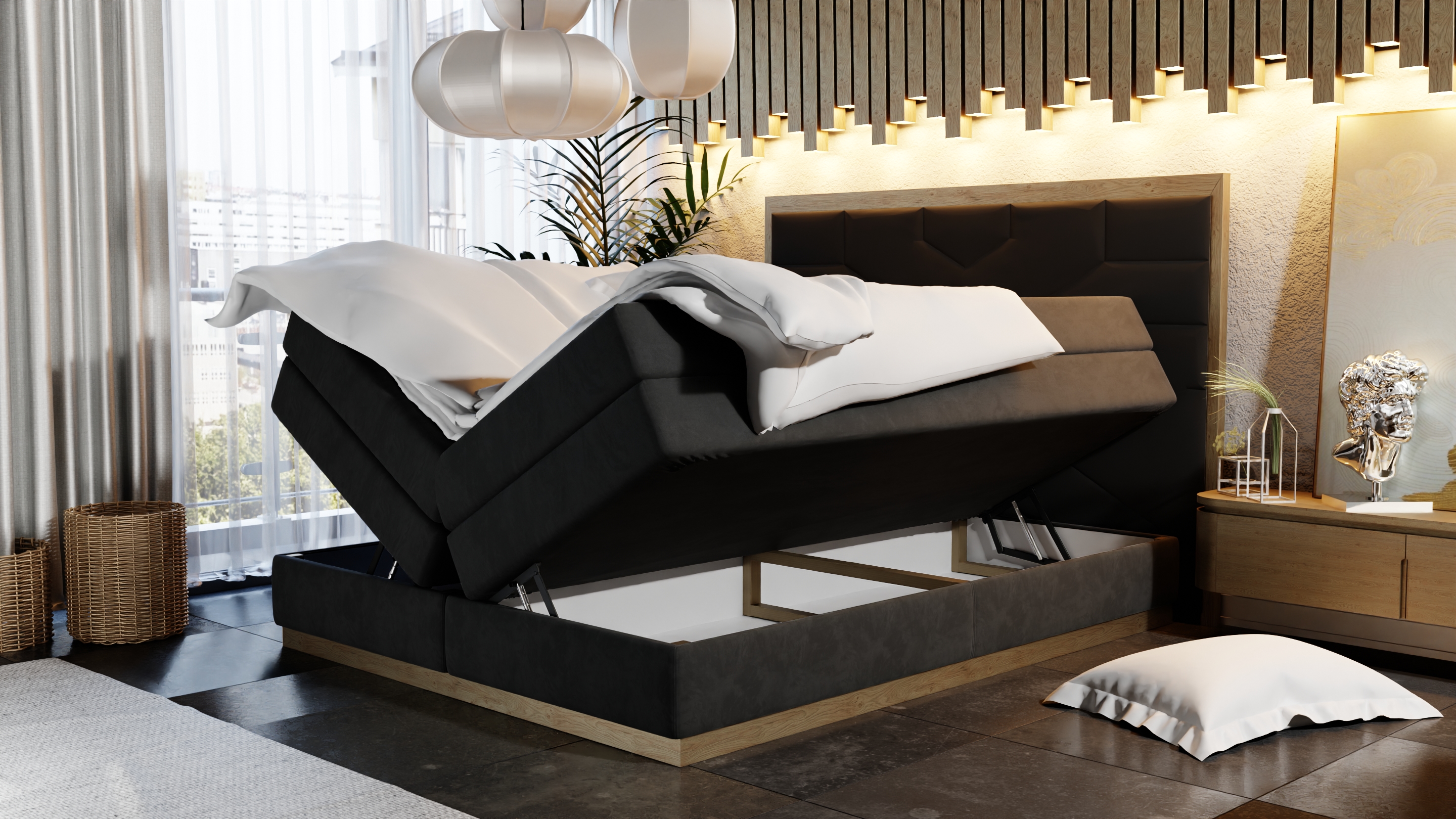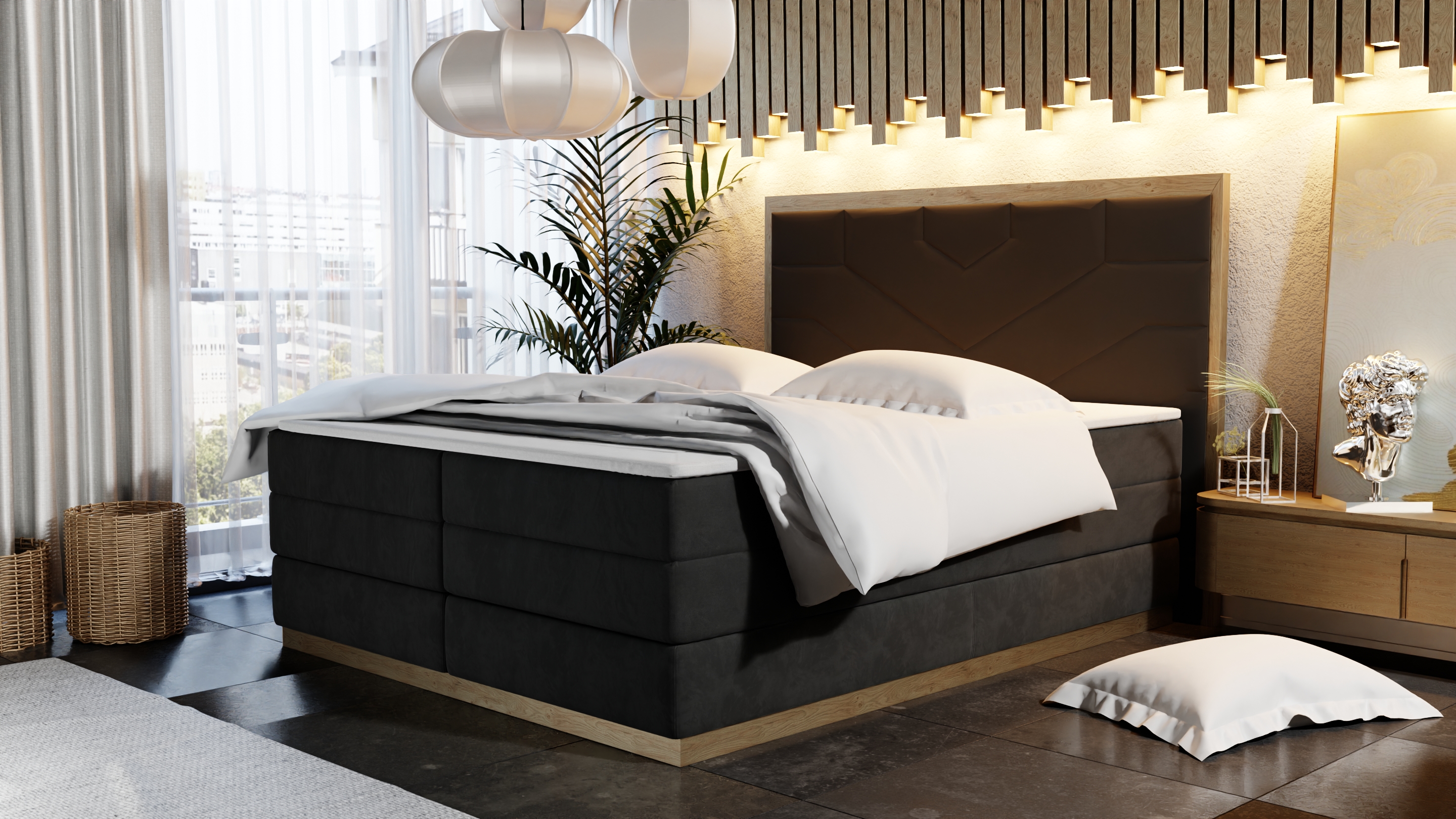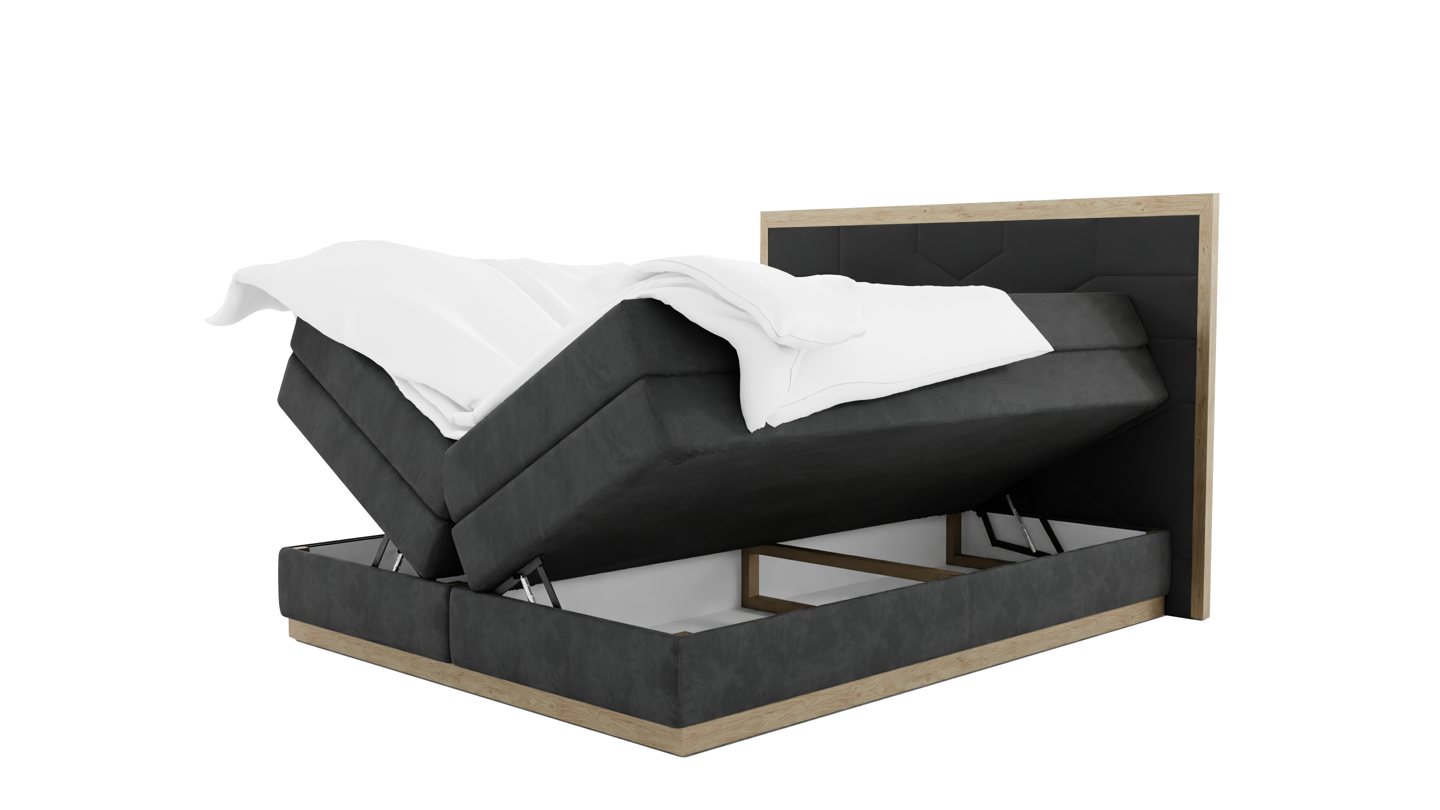 Górna warstwa to materac kieszeniowy, którego wysokość z górną krawędzią sięga aż 70 cm. Nadaje to łóżku luksusowego charakteru i gwarantuje wyjątkowy komfort użytkowania.