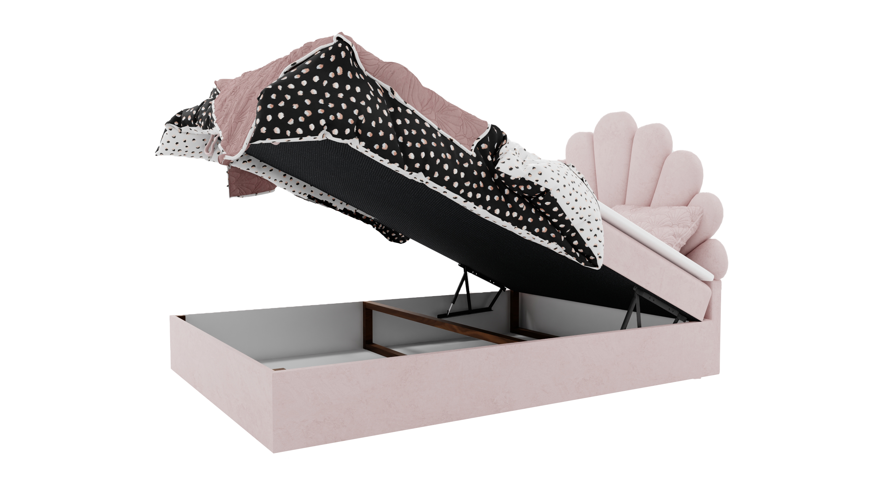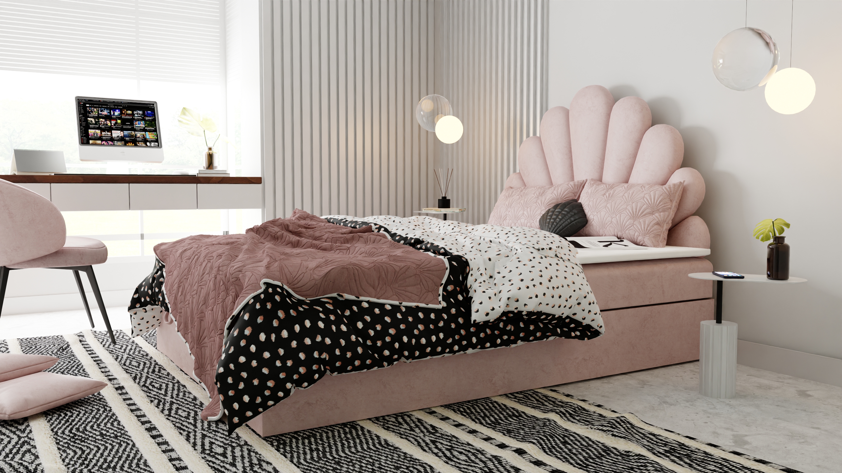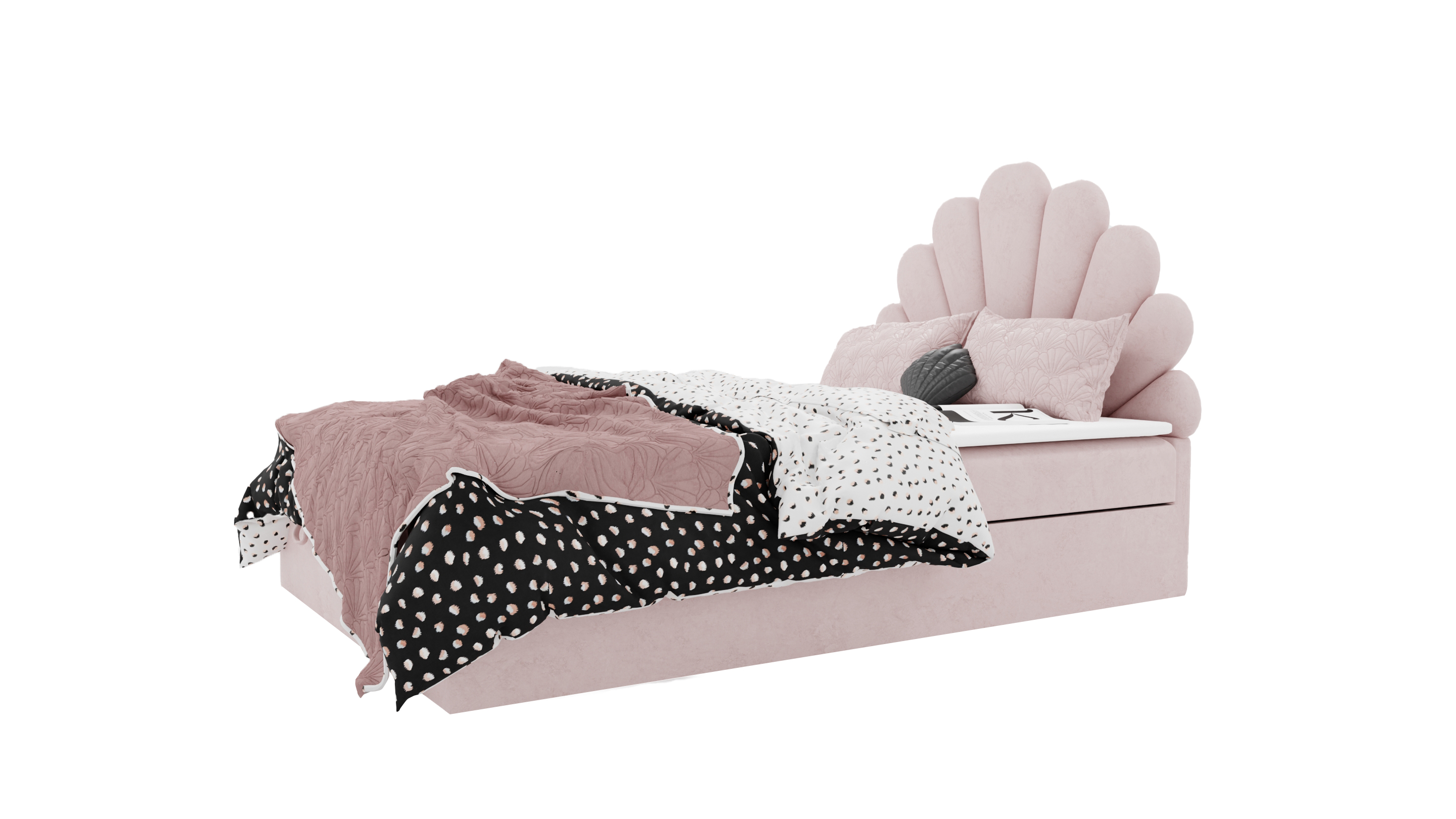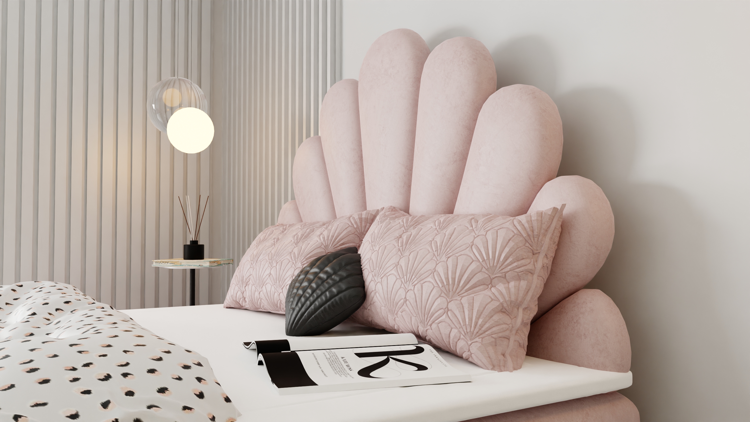 Łóżko KOTILO wyróżnia się niezwykłym zagłówkiem w formie delikatnej muszli. Ten dziewczęcy, subtelny design nadaje sypialni wyjątkowego charakteru i sprawia, że łóżko staje się centralnym punktem aranżacji. Elegancja połączona z wdziękiem tworzy atmosferę pełną przytulności i stylu.