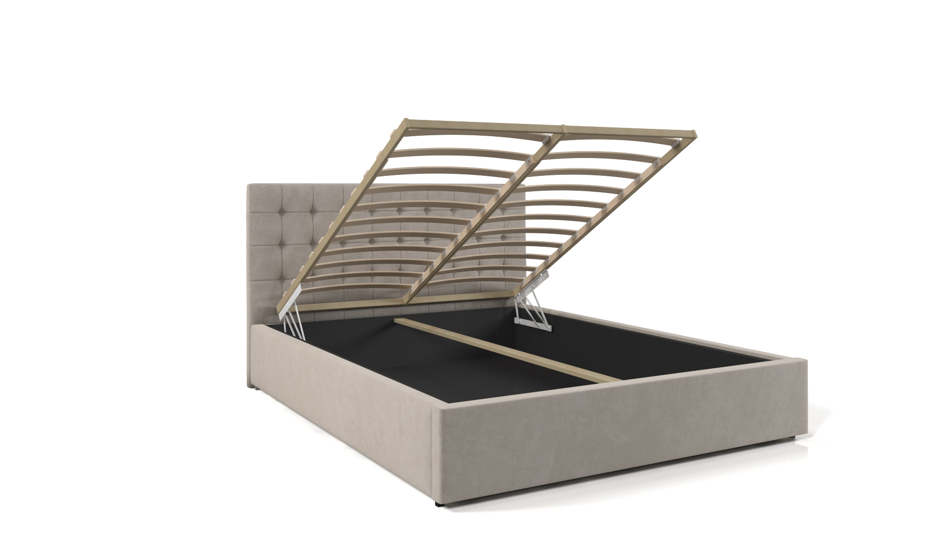 Model został wyposażony w obszerny pojemnik na pościel, otwierany od przodu.