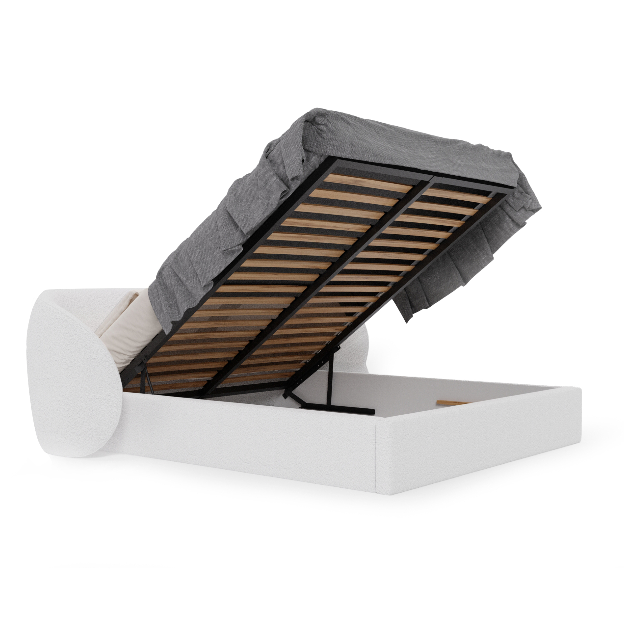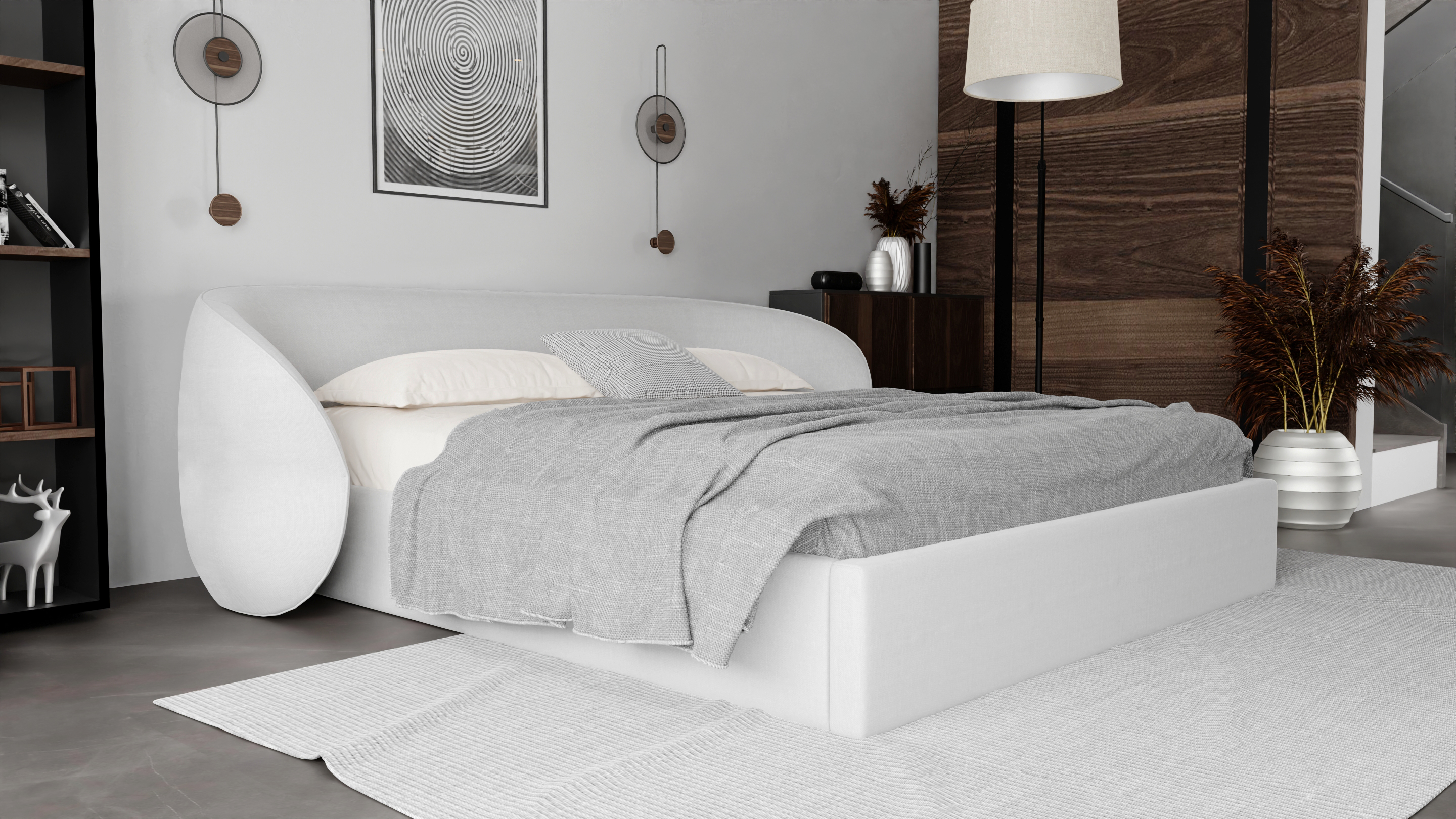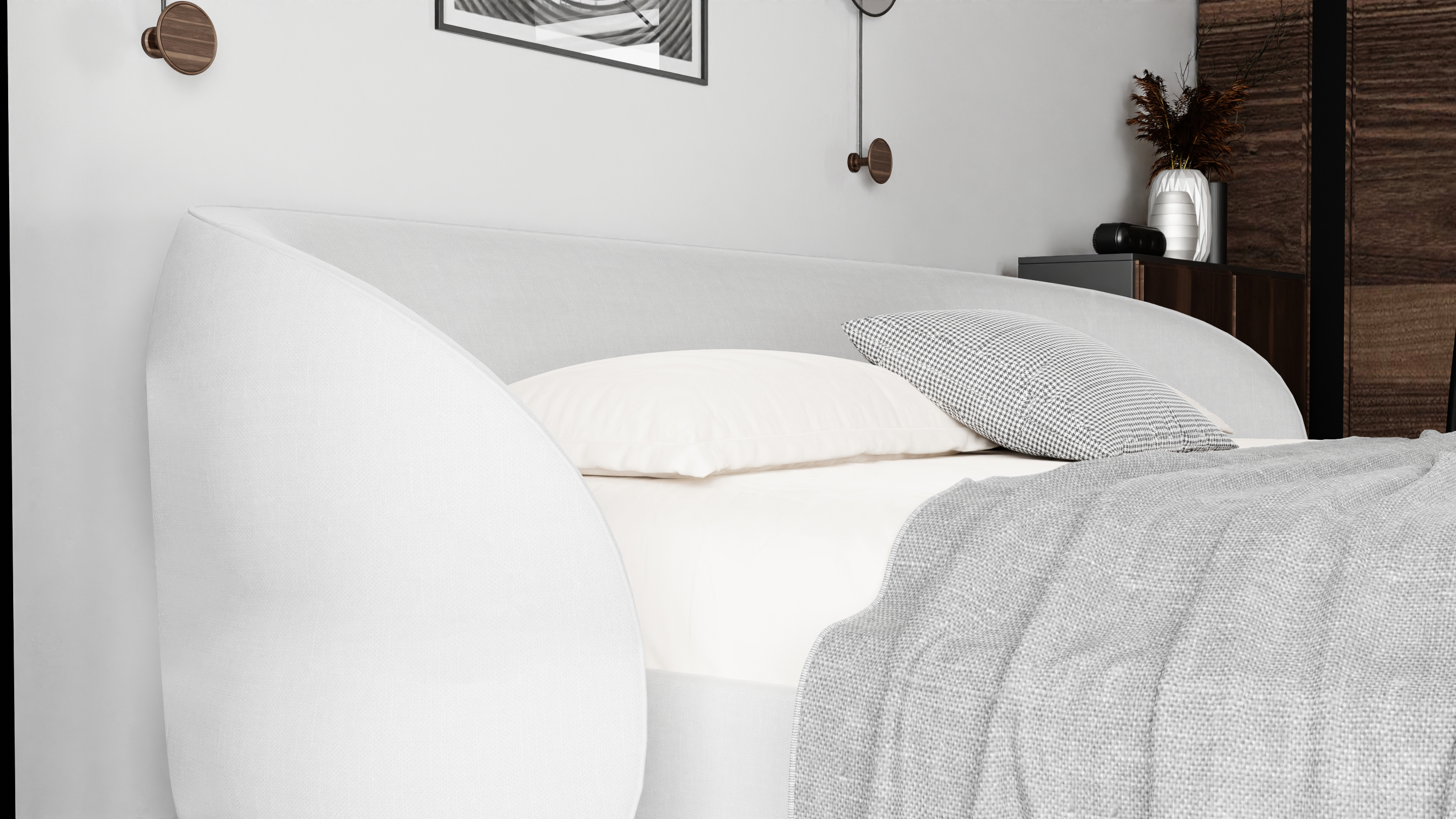 Wyjątkowy zagłówek o ekstrawaganckim charakterze podkreśla indywidualność wnętrza, a solidna konstrukcja z wbudowanym stalowym stelażem i praktycznym pojemnikiem na pościel sprawia, że łóżko jest nie tylko piękne, ale i wygodne w codziennym użytkowaniu