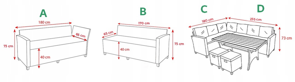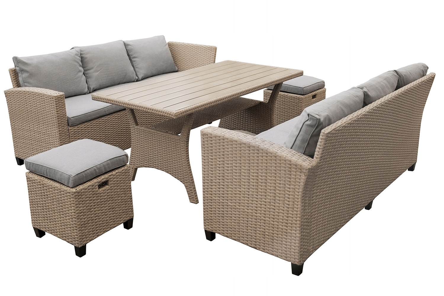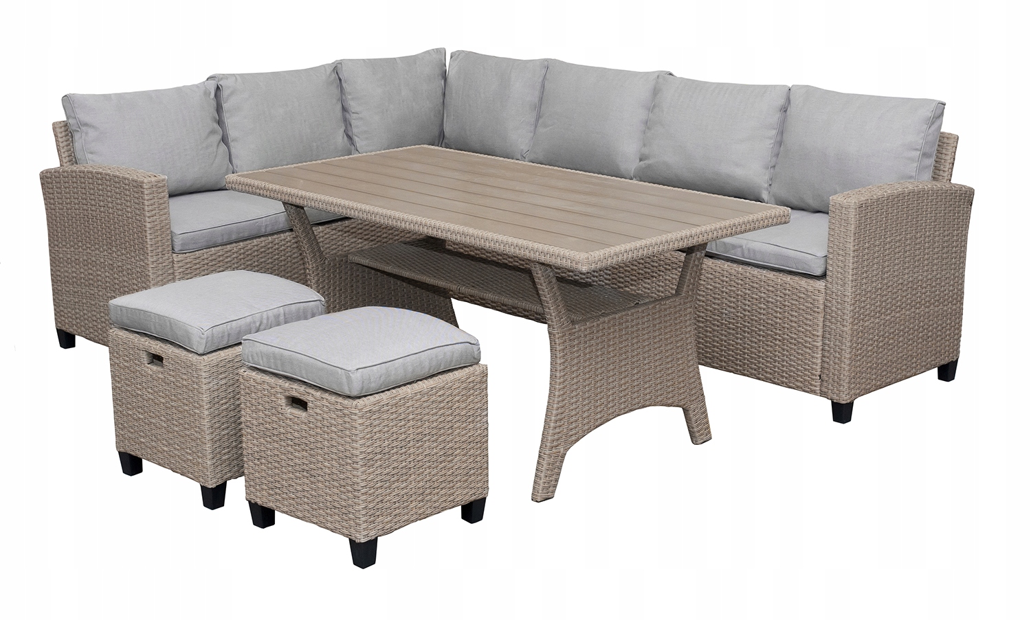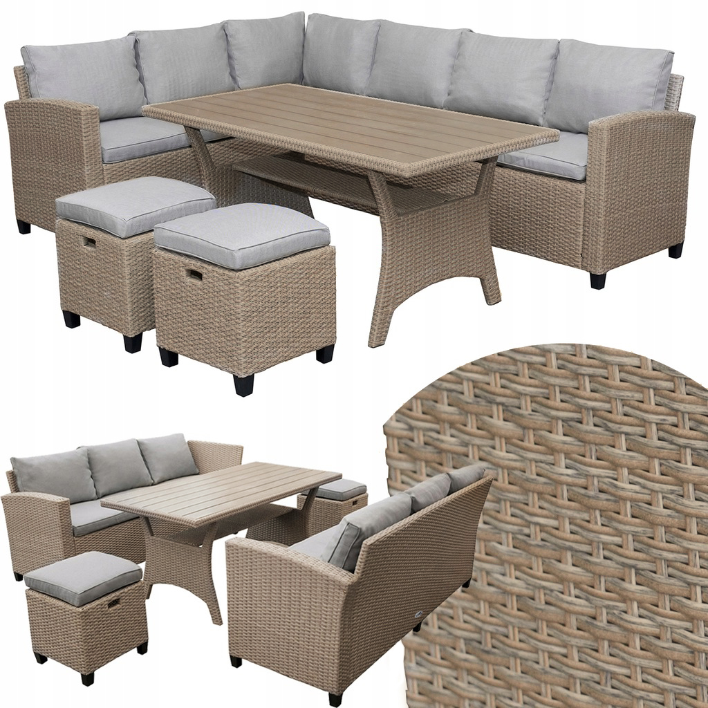 W zestawie znajdują się grube, wygodne poduszki, które gwarantują komfort podczas wypoczynku. Stolik kawowy dopełnia całość, tworząc funkcjonalną i estetyczną przestrzeń.