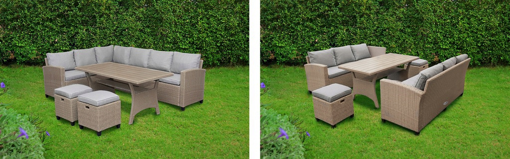 Solidna stalowa konstrukcja zapewnia stabilność i bezpieczeństwo, a nogi imitujące drewno dodają elegancji. Modułowa budowa narożnika umożliwia różne ustawienia – możesz korzystać z niego jako jednej całości z pufami lub rozdzielić na dwie sofy i dwa osobne siedziska.