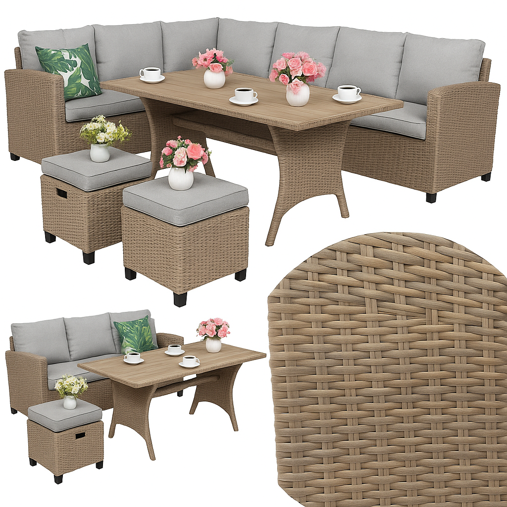 Zestaw ogrodowy o idealna propozycja dla miłośników stylowego wypoczynku na świeżym powietrzu. Wykonany z odpornego na warunki atmosferyczne technorattanu PE, zestaw jest trwały, łatwy w utrzymaniu czystości i przeznaczony do codziennego użytku w ogrodzie, na tarasie lub balkonie.
