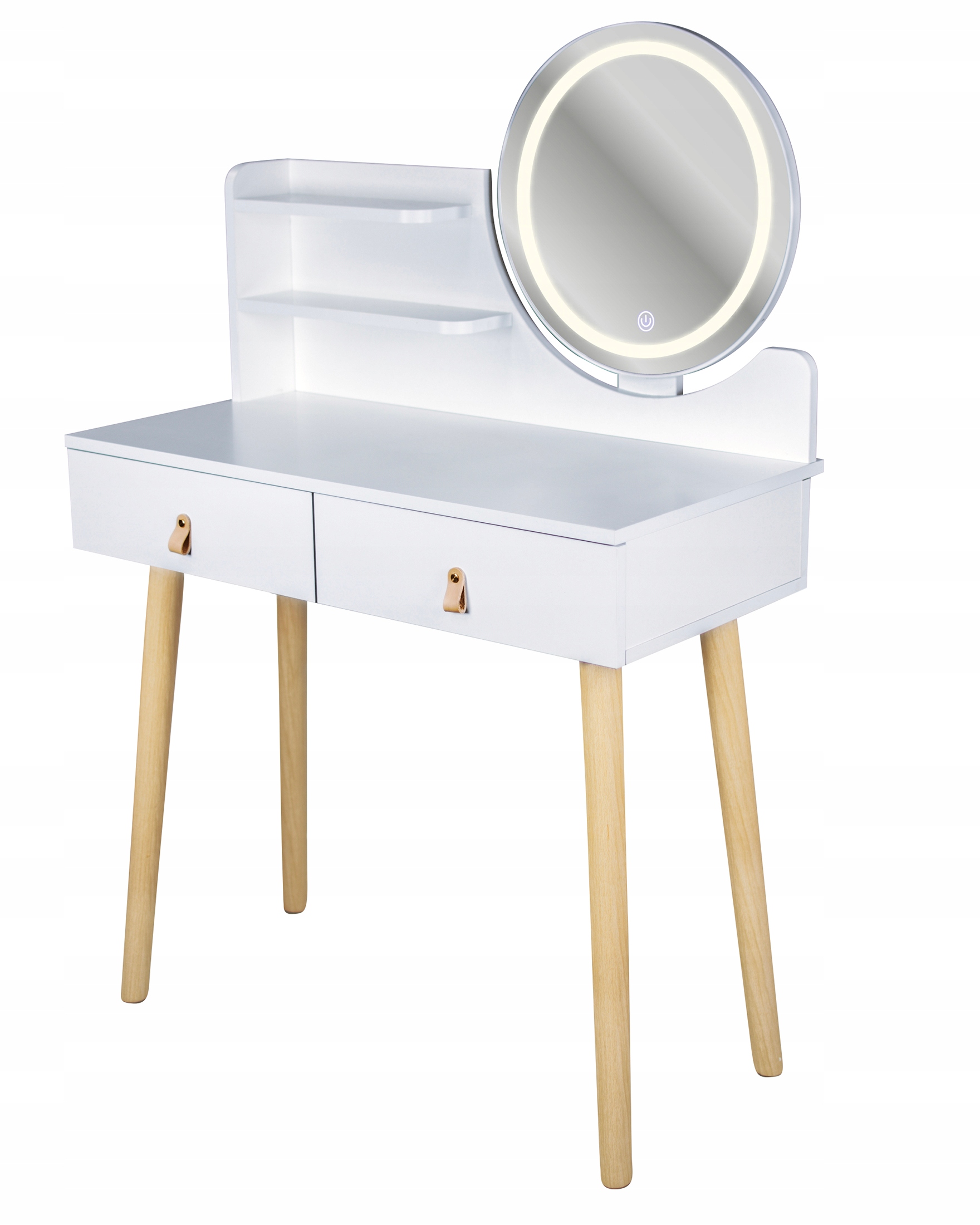 Przedstawiamy nowoczesną toaletkę z lustrem LED w modnym białym kolorze z dodatkiem jasnego buku. To praktyczny i stylowy mebel, który doskonale sprawdzi się w sypialni, garderobie czy pokoju nastolatki.
