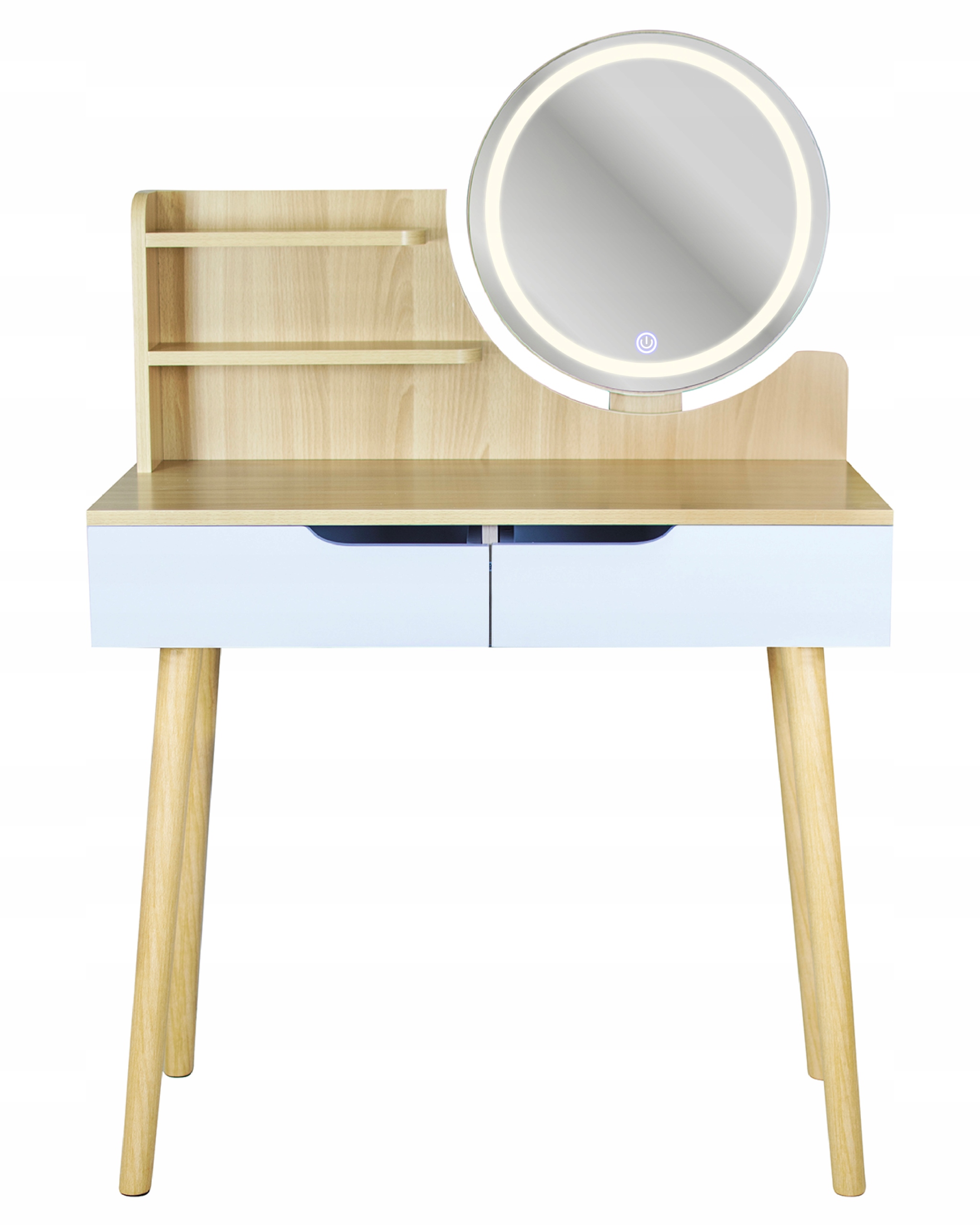 Przedstawiamy nowoczesną toaletkę z lustrem LED w modnym białym kolorze z dodatkiem jasnego buku. To praktyczny i stylowy mebel, który doskonale sprawdzi się w sypialni, garderobie czy pokoju nastolatki.
