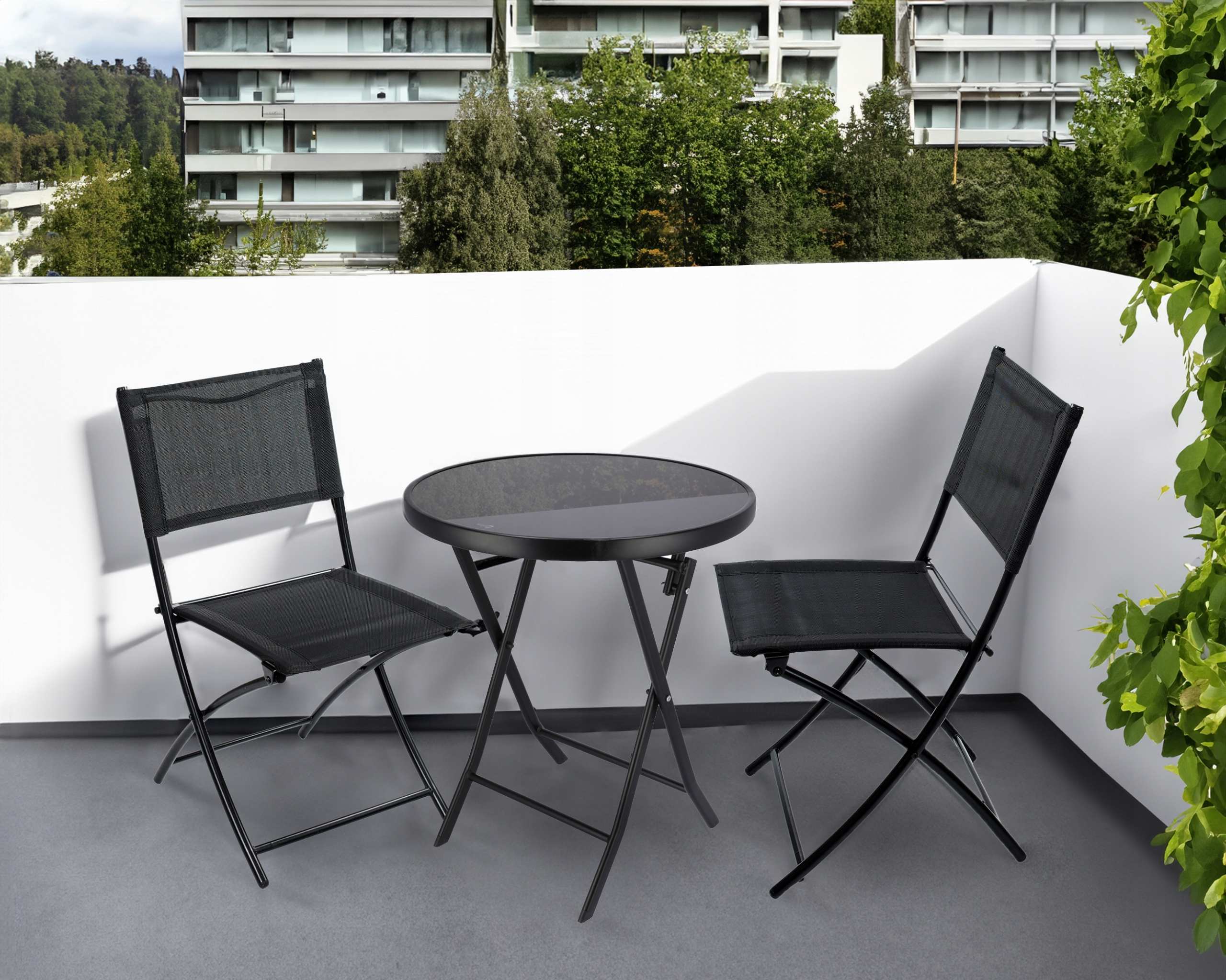 Meble wykonano z trwałej stali malowanej proszkowo, hartowanego szkła oraz wytrzymałego materiału textilene. Zestaw cechuje się odpornością na zmienne warunki pogodowe i promieniowanie UV. Lekka konstrukcja ułatwia przenoszenie, a całość jest łatwa do utrzymania w czystości.